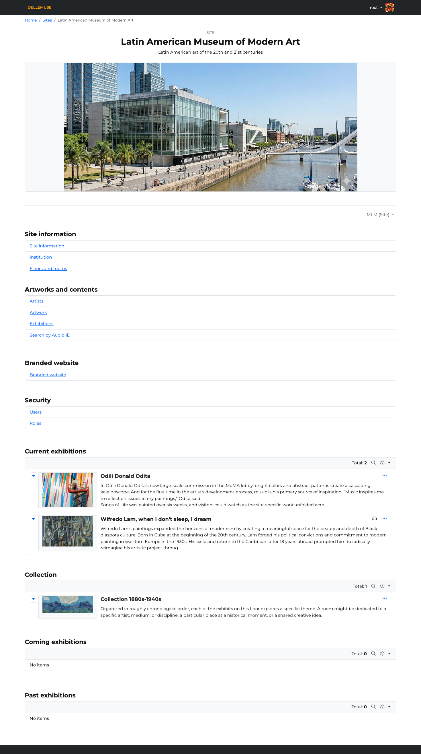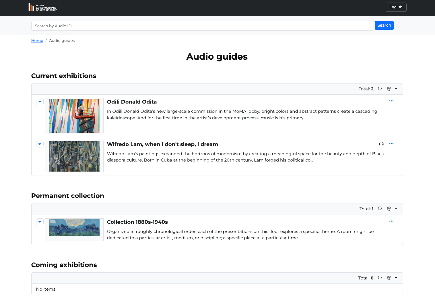 The institution uploads and manages its permanent and temporary works and exhibitions using a simple web application. Each exhibition, and each work within it, can have a curatorial text that is edited by the institution in the same web application.
