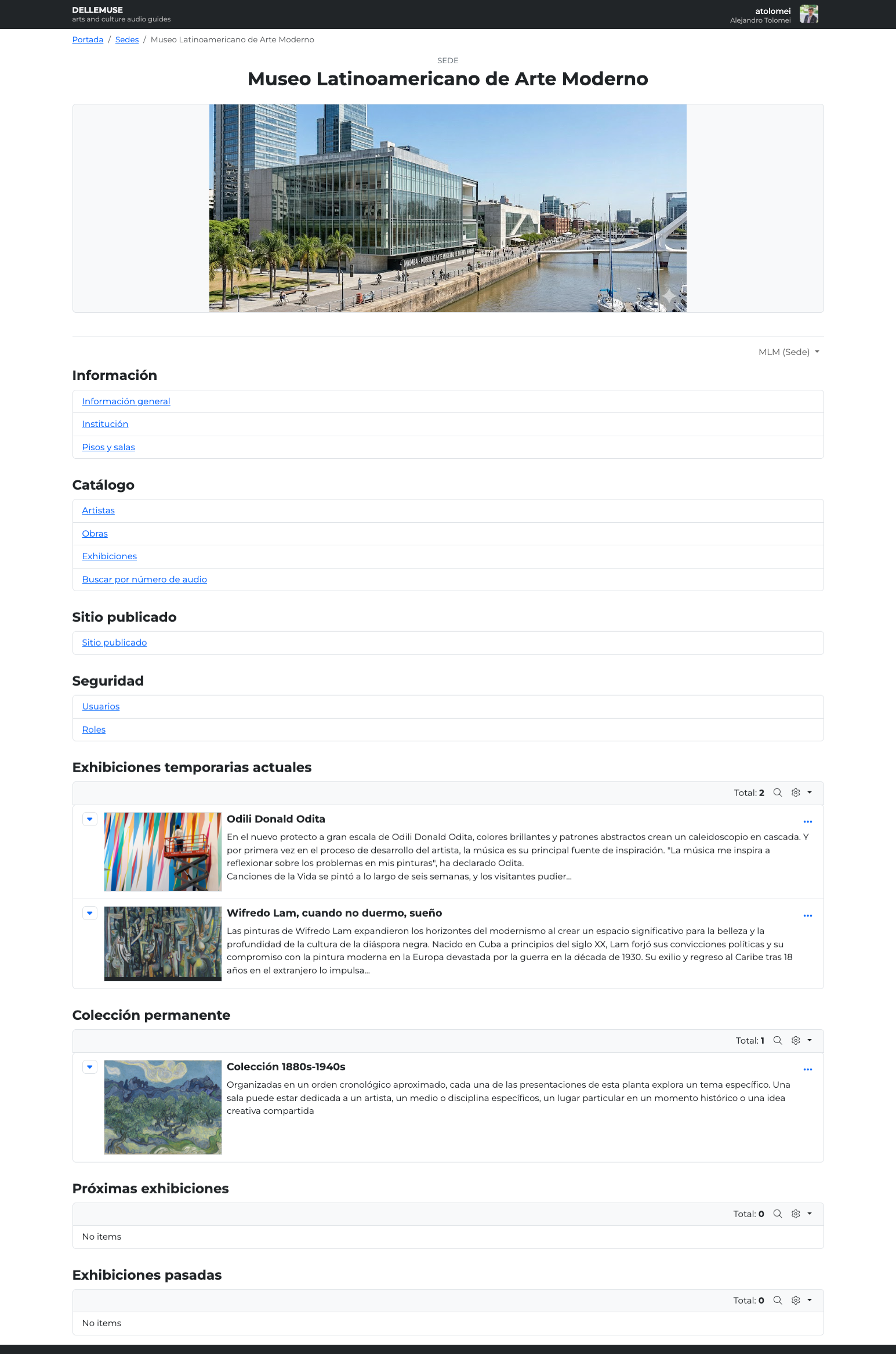 El museo o institución utiliza una aplicación web sencilla donde carga y administra sus obras y exhibiciones permanentes y temporarias. Cada exhibición, y cada obra en la exhibición, puede tener un texto curatorial que lo edita la misma instutitucón.
